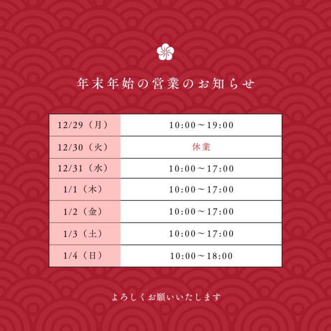 2023年もマユヤマジュエラーを御愛顧頂きまして誠にありがとうございました。 これからもお客様に感動と輝きを与えるジュエリーをご提供するべく努力していきます。 2024年もマユヤマジュエラーのジュエリーにご期待ください。 以下、年末年始のマユヤマジュエラーの営業時間です。30日は